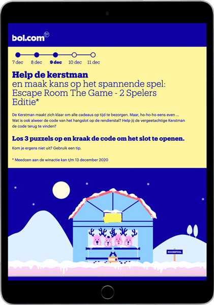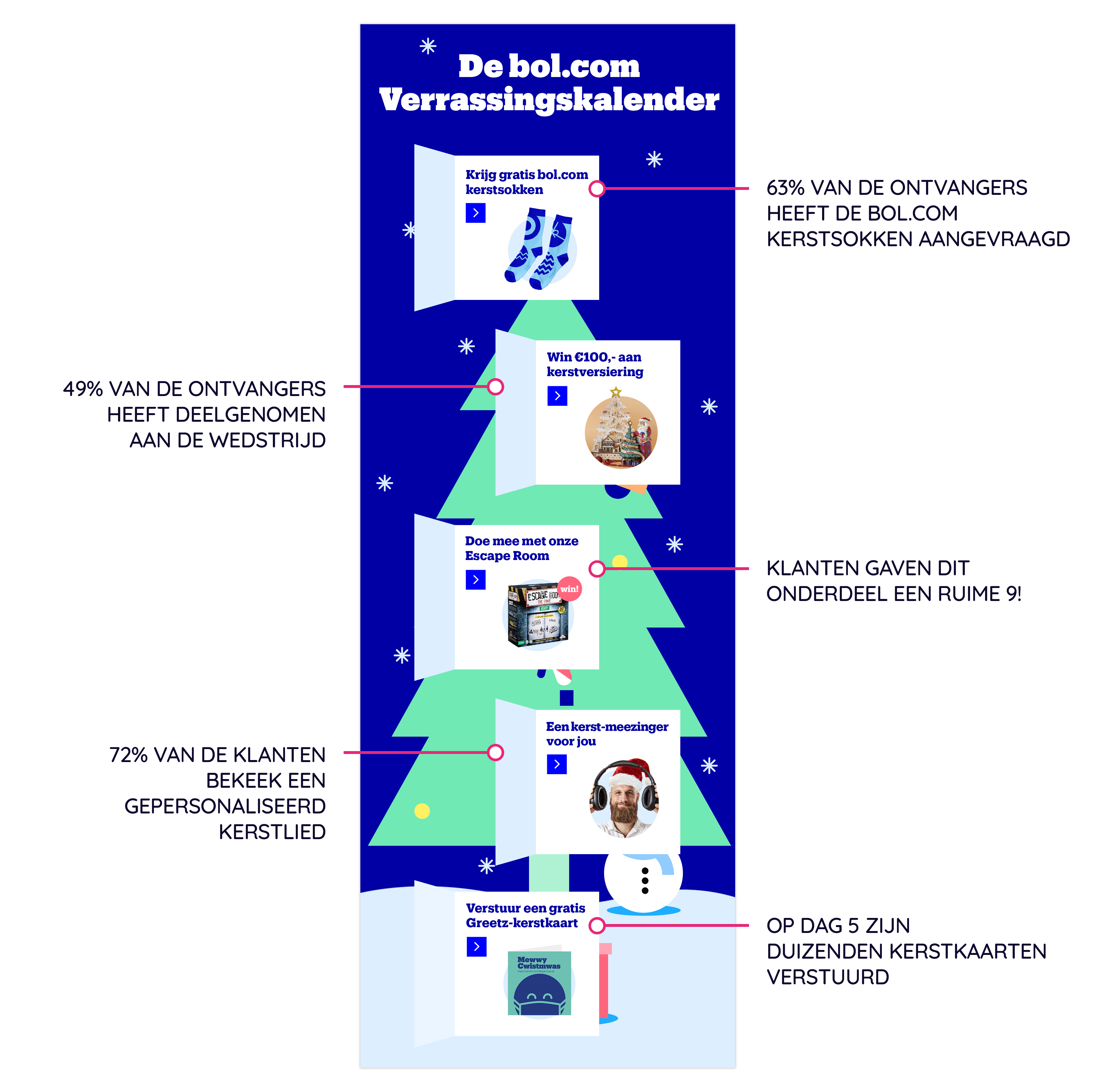 Het einde van een jaar is altijd een bijzonder moment. bol.com vindt klantwaardering erg belangrijk en zocht een leuke manier om alle klanten rondom de feestdagen in het zonnetje te zetten. Met dat doel voor ogen hebben we samen een verrassingskalender ontwikkeld. Vijf dagen lang kregen klanten een interactieve e-mail waarin ze iedere dag een nieuw vakje met een leuke verrassing mochten openmaken. Achter het luikje zag de klant een voorproefje van de verrassing van die dag. Op de speciaal voor de campagne ontwikkelde landingspagina's werden de verrassingen vervolgens verder uitgelegd.