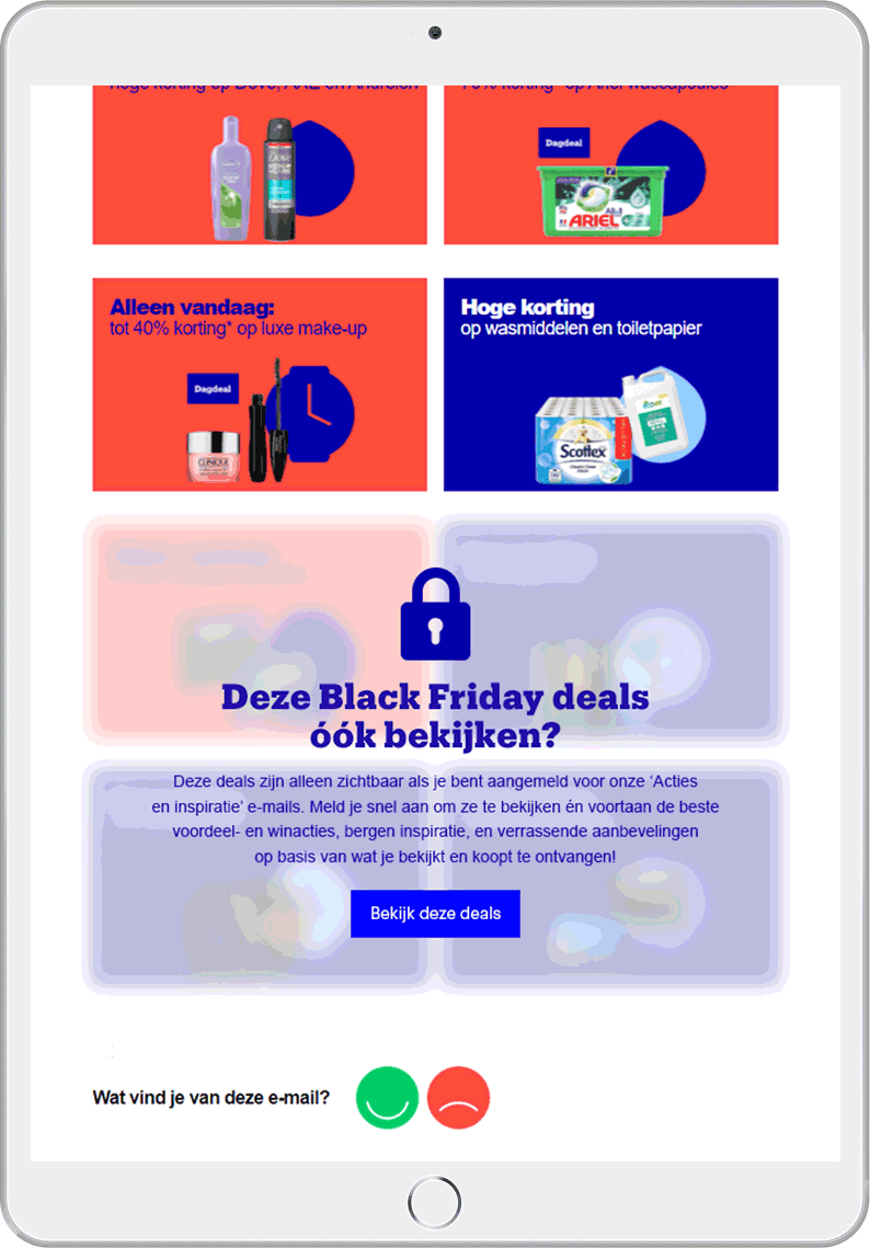 In een e-mail vol speciale Black Friday deals zijn extra deals verstopt, die alleen zichtbaar werden als klanten hiervoor een extra opt-in afgaven. Dit konden ze doen met één simpele klik, waarna de verborgen deals direct zichtbaar werden. Wat deze innovatie uniek maakt is dat we met één techniek de relevantie van een opt-in lieten zien én klanten op een laagdrempelige manier een opt-in lieten afgeven, zonder dat ze hiervoor de e-mail hoefden te verlaten.