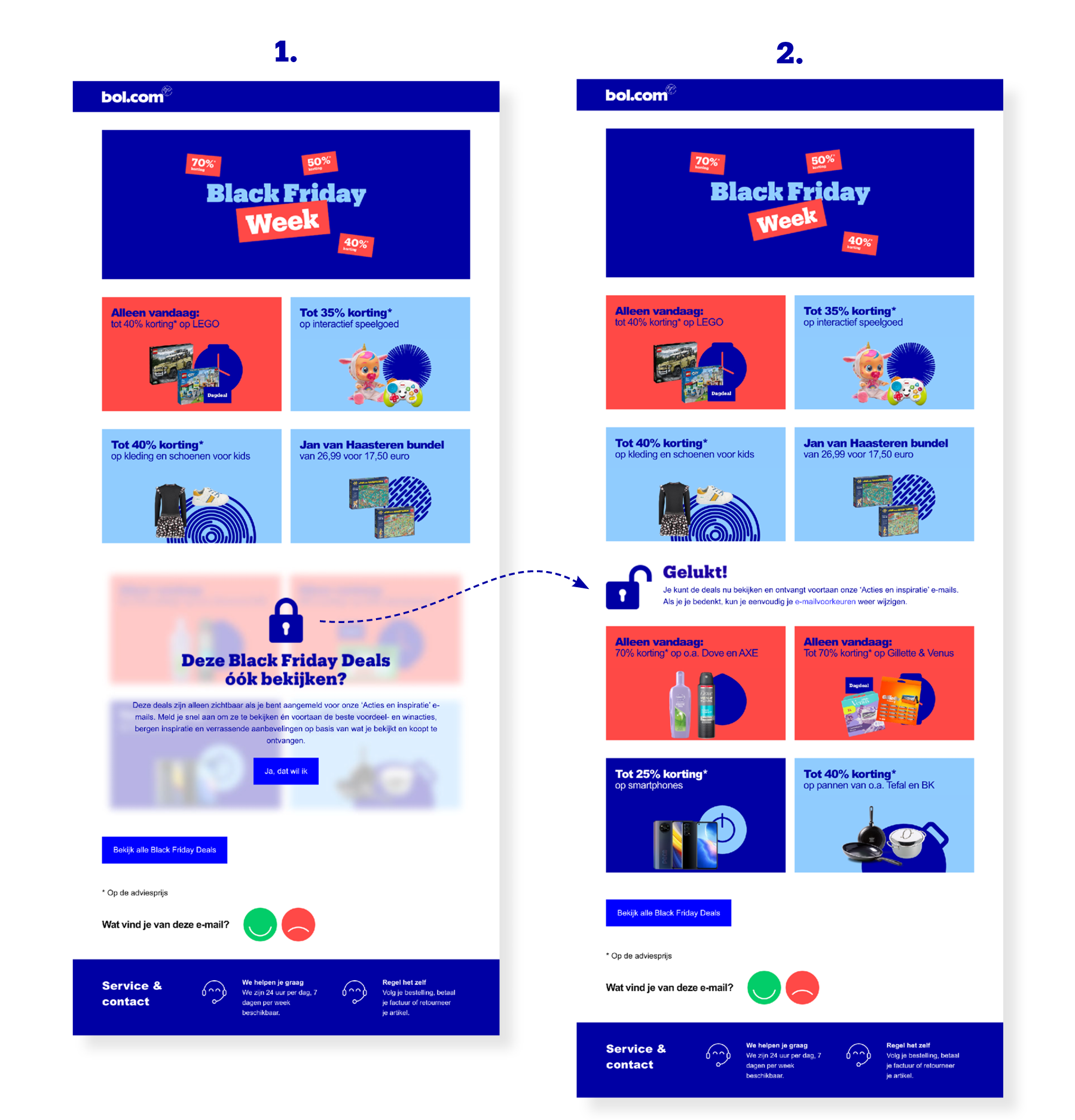 Niet alle klanten zijn zich ervan bewust dat er verschillende opt-ins zijn en dat uitbreiding met een extra opt-in (in dit geval ‘acties & inspiratie’) hen bepaalde voordelen kan opleveren. Het is bewezen dat opt-in verrijking via e-mail voor bol.com goed werkt, want een zeer groot deel van de in 2021 gerealiseerde opt-in verrijking is gerealiseerd via het kanaal e-mail. Binnen sales-gedreven e-mails bleek het echter een uitdaging om klanten de relevantie van een andere opt-in aan te tonen zónder af te leiden van het doel van de mail.